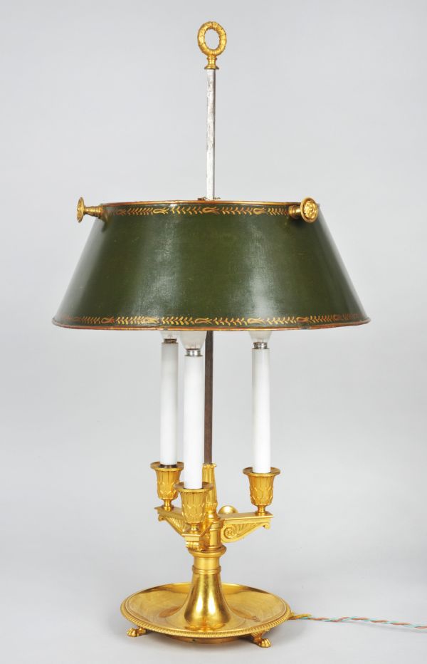 Plateau en cuvette à bord molleté feuilles d'eau porté par 3 griffes de lion. centre tourné avec partie centrale élevée portant la tige carrée sur laquelle glisse un balustre auquel est accroché 3 consoles portant petit vase en forme de cornets, ciselé formant bobèches avec binet, équipées fausses bougies. Clé d'arrêt à bouton tourné et rosace. Abat-jour tôle peinte supporté par un croisillon à 3 branches et fixé par 3 boutons à rosace dont un forme clé de la coulisse du dit abat-jour terminé par l'anneau ciselé.