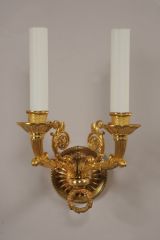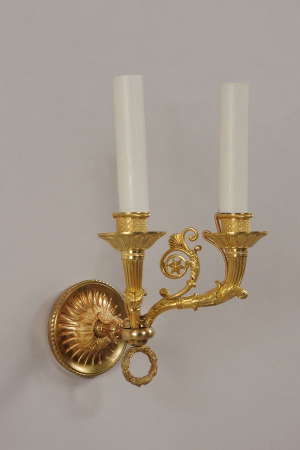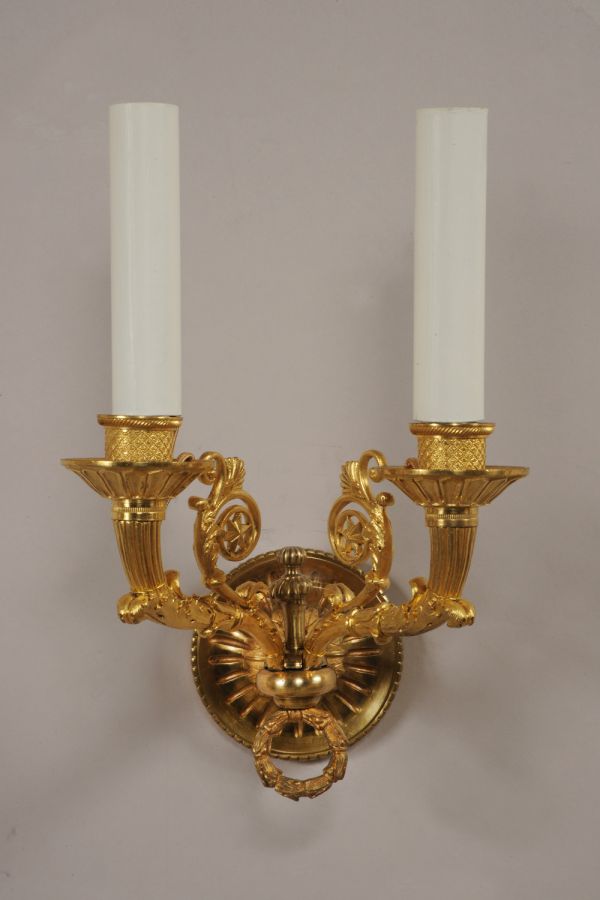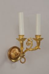 Platine circulaire avec piédouche portant une graine d'où partent 2 branches en cornet et rinceaux avec bassin et binet ciselés. Equipée, fausses bougies.
