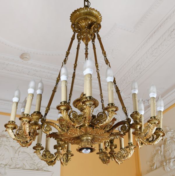 Coupe de feuillages palmettes et rinceaux terminée par une pomme de pin ciselée, tournée et surmonté d'une coupe avec flammes. Ce groupe est suspendu par cinq tiges reliées aux volutes. Du pavillon et de la coupe partent cinq groupes de branches à trois cornets et un petit vase central. Equipé de fausses bougies.