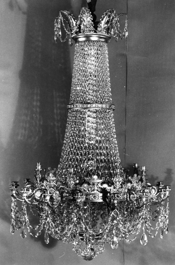 Forme générale en demi sphère sous piédouche faits, 1° de rangs de pastilles taillées rondes, 2° de mêmes rangs pastilles ovales plus petites et coupé d'une ceinture ciselée de rosaces en fond creux ; à la base, petit festonnage de perles autour d'une sphère taillée. Ceinture à fond creux ornée de motifs de rinceaux et de rosaces alternés de seize branches en arc et à volute ciselée ; l'extrémité s'évasant en fleur de lys formant bobèche équipée de fausses bougies. Sur la ceinture, seize coupes alternées de culots à rinceaux. Cette ceinture soutenue par huit branches en arc, partant de l'enfilage, lequel est formé d'un balustre à profil ciselé et d'un fût côtelé s'évasant dans le haut pour soutenir le pavillon circulaire à bord godronnés et surmonté de huit palmettes ciselées et évasées ; dans la partie médiane une ceinture ciselée ; toutes les branches réunies par des doubles guirlandes de cristaux taillés et amandes comme les palmettes du pavillon ; l'ensemble garni de cristaux en guirlandes partant du pavillon à la ceinture et en dessous de la ceinture formant vasque en dôme renversé terminé par une boule en cristal taillé. Vers 1836.