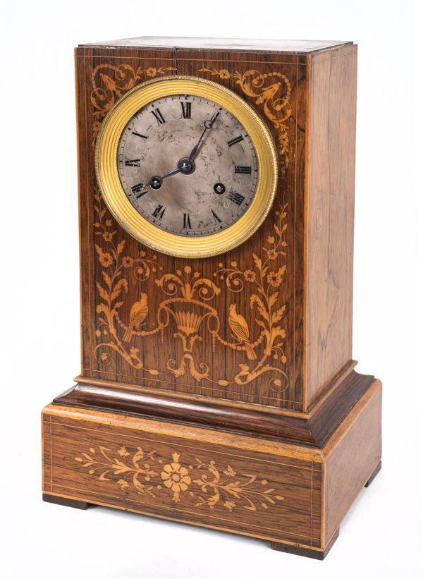 Une borne rectangulaire à plinthe grosse moulure en congé sur 4 petits patins rectangulaires. Marqueterie en façade. Plinthe rosace et feuillages à la borne branchages et oiseau. Arêtes et filets en buis. Cadran circulaire métal argenté lunette ouvrante moulurée et moletée. Verre bombé.