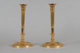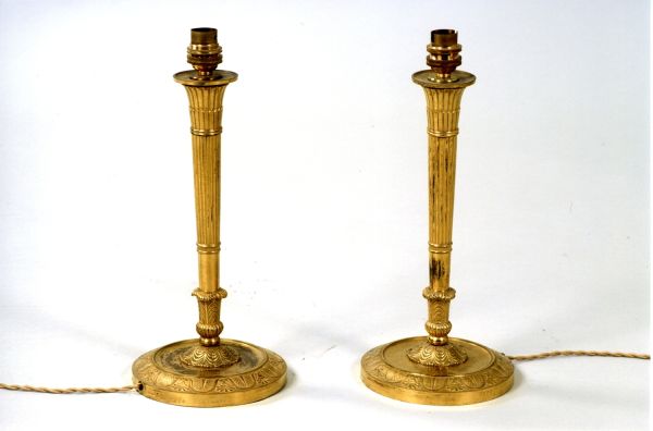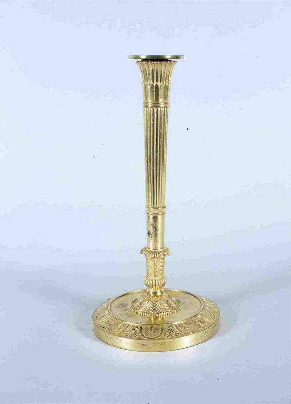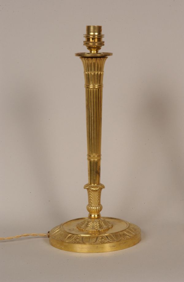 Bronze doré. Socle circulaire bord en doucine ciselée de rinceaux et palmettes, centre concave uni portant à l'axe un culot évasé, retourné fait de palmettes à rouleau et supportant 1 culot en vase à base à godrons, le bord festonné formant pied du fût tourné en gaine à petits godrons verticaux entre 2 doubles-bagues ; la base unie et le sommet évasé en 2 rangées festonnées formant bobèche et équipé douille double bague à abat-jour parchemin rouge à étoile perforées. Vers 1808. Auteur présumé : Claude Galle.