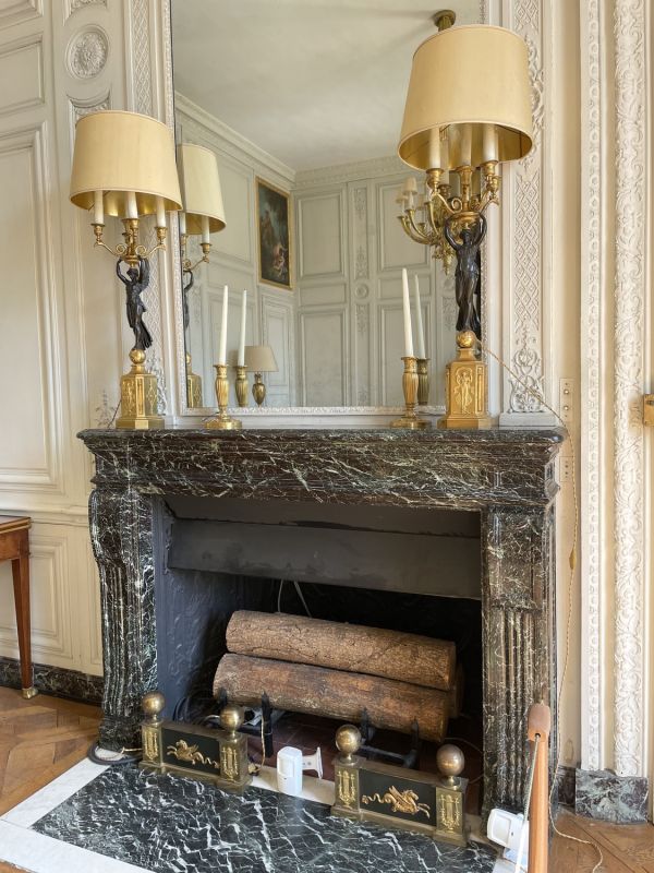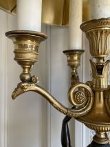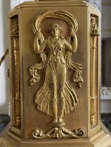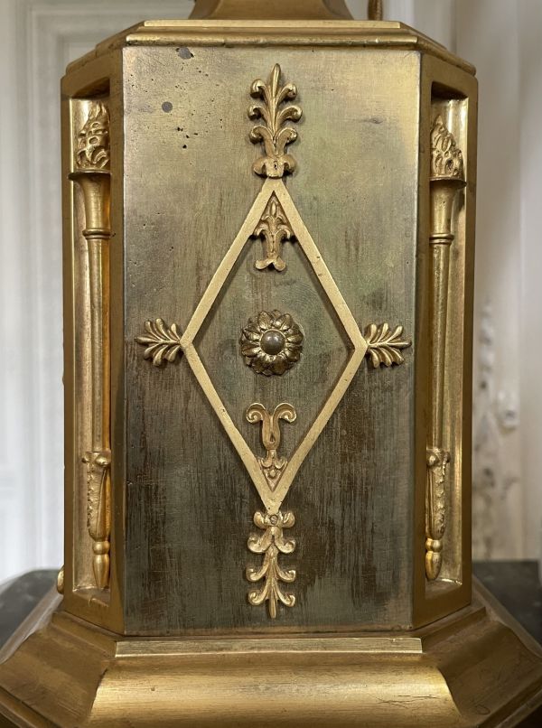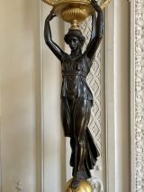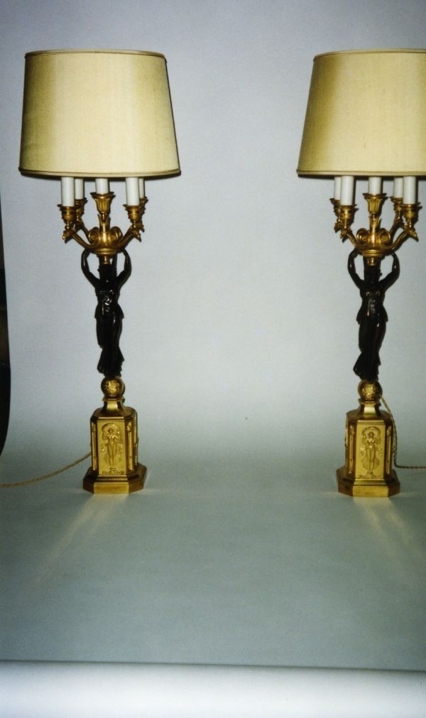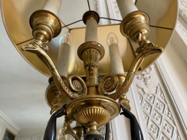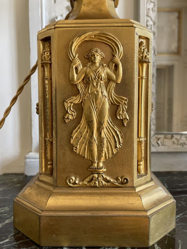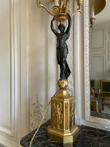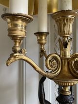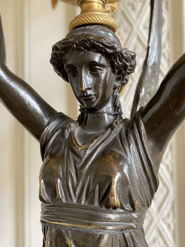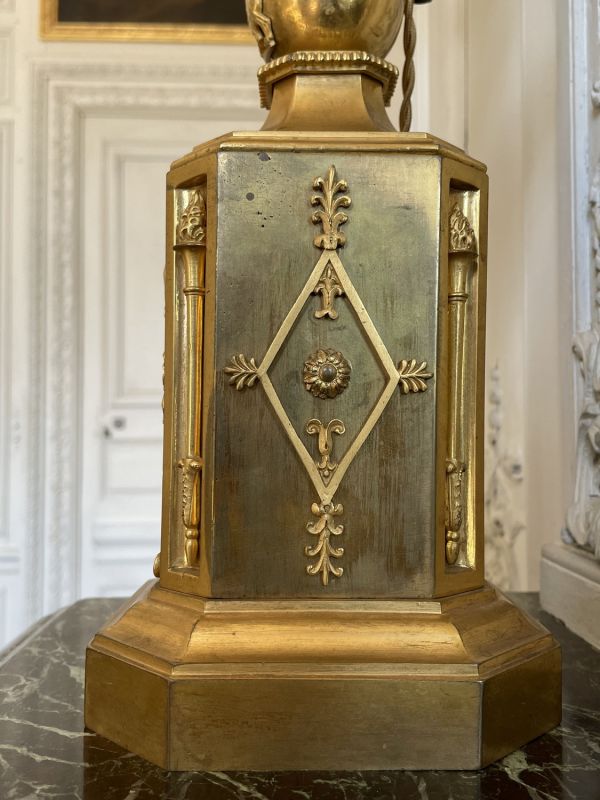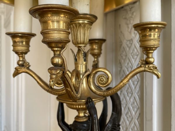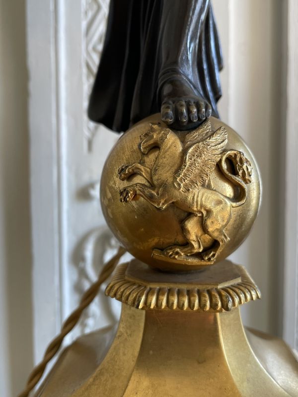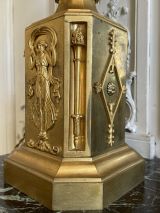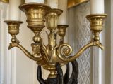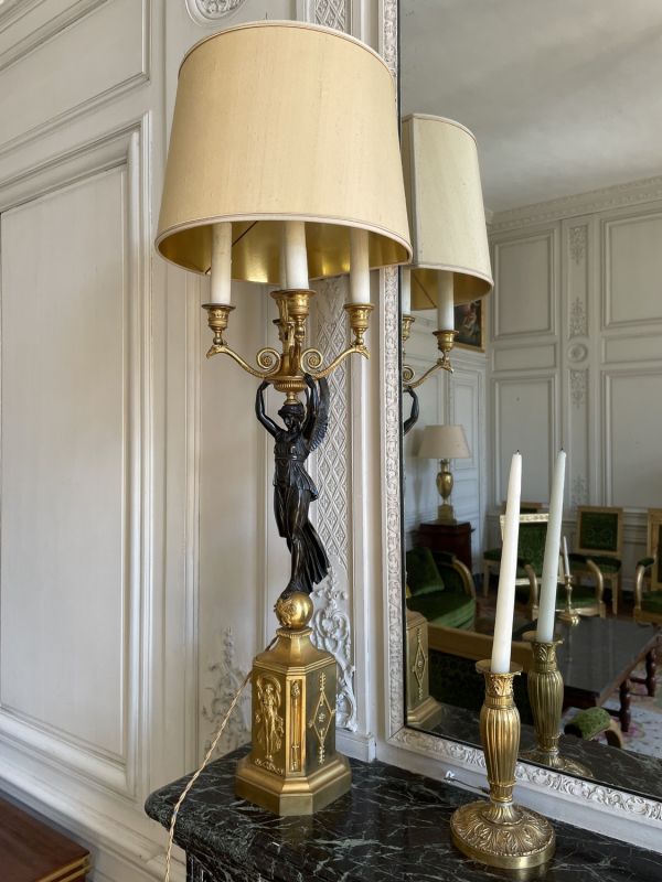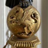 Socle rectangulaire à pans coupés, orné sur la face d'une Renommée et sur les côtés de losanges, et de flambeaux dans une cavité ; boule ornée d'un griffon portant une femme ailée ayant sur sa tête une vasque d'où partent 4 branches en S terminées par tâte d'aigle, supportant binet et bobèche.