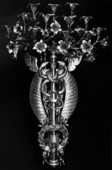 Grande platine formée d'un caducée (serpent ailé enroulé sur un bâton orné) sur lequel est attachée par un ruban, une couronne de feuilles d'olivier avec bouquet de boutons de graine, surmonté d'une double palme courbe formant médaillon, à l'arrière de celui-ci partent six branches de fleurs de lys naturelles avec feuilles, boutons et fleurs, dont dix formant binet pour bougies