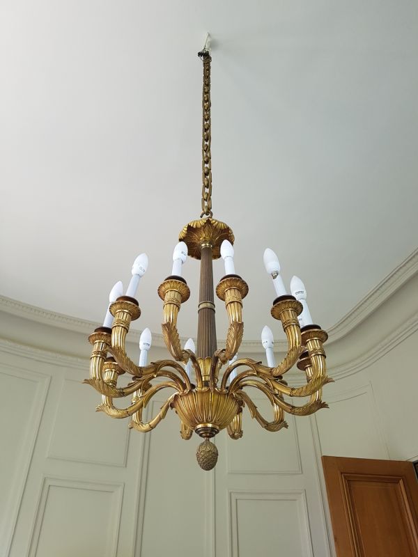 - Culot terminé par une pomme de pin, d'où partent 12 branches en S, feuilles ciselées d'où sort une tige godronnée avec bobèche équipée à fausse bougie. Tige centrale et pavillon en feuilles retombantes.