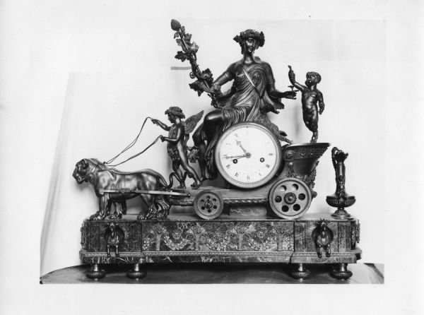 Socle marbre vert de mer à coins arrondis orné de biches, corbeilles, et guirlandes, surmonté du char des vendanges, trainé par des léopards. Dans le mouvement, cadran circulaire émaillé avec les quantièmes, signé "Dubuc le Jeune". Sur le mouvement est assise une allégorie avec les ceps de vigne, petit faune tenant une grappe et flanqué d'une aiguière.