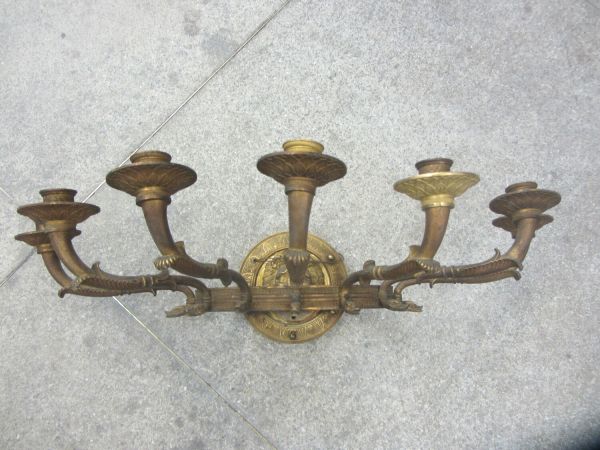 Platine circulaire dont la bordure est ciselée de feuilles et de palmettes. Au centre : tête de lion tenant un ovale moleté d'où partent 7 branches à tête de cygne portant bassin et binet ; équipées fausses bougies.