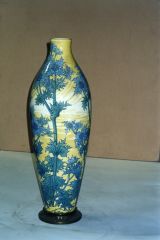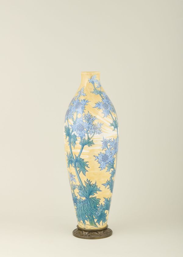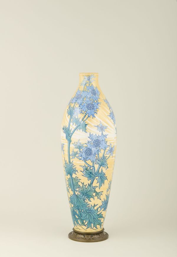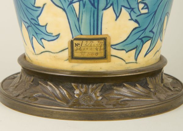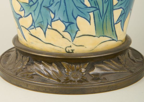 Base circulaire bronze ciselé médaille en cavet ornée de feuilles et fleurs en rosaces carrées ciselées et patinées médaille. Forme fuseau à fond jaunâtre dégradé, orné de branches de chardons vert et violine.