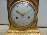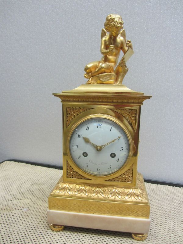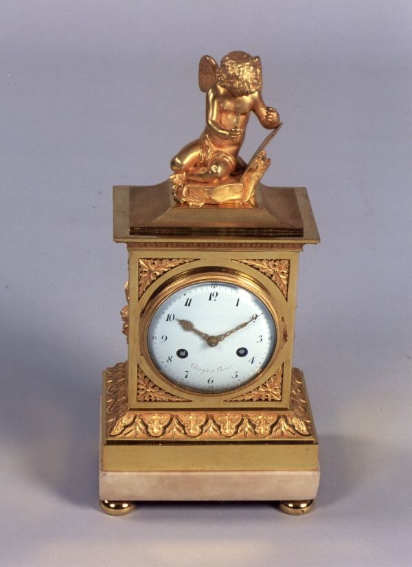 Socle rectangulaire marbre blanc uni portant la base rectangulaire moulure ciselée d'une borne rectangulaire, côtés fond creux orné d'appliques d'attributs et feuilles de lauriers, face cadran émail blanc "Thiéry à Paris" avec lunette molleté ouvrante et verre bombé. Ecoinçons feuilles triangulaires. Corniche saillante ornée feuilles d'eau et le dessus à socle surmonté de l'Amour Peintre accroupi sur un rocher, le tout or mat et bruni.