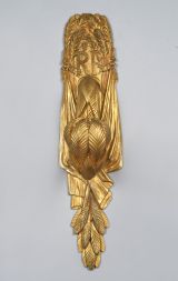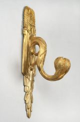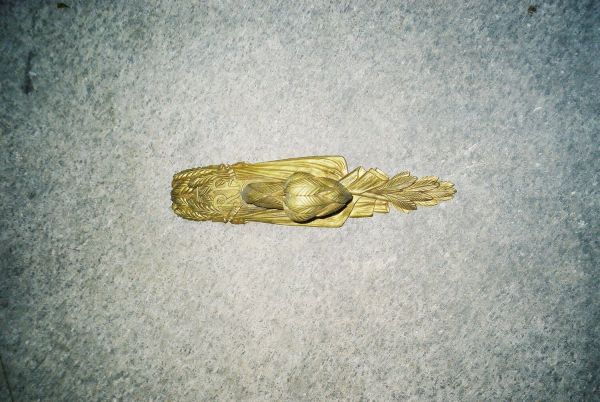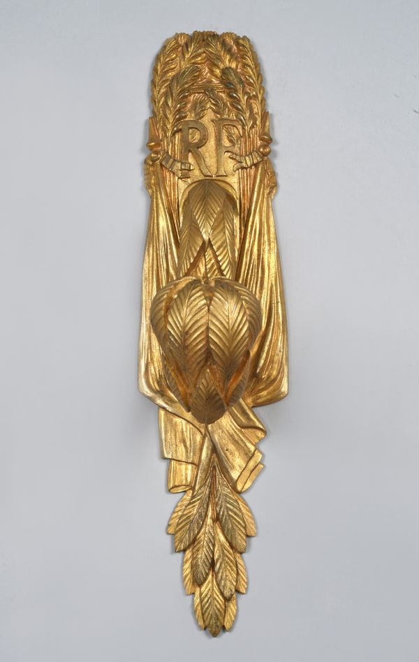 Patère formée de 2 drapeaux en faisceaux surmontés d'épis de blé encerclant le monogramme R F ; feuilles de laurier à la base.