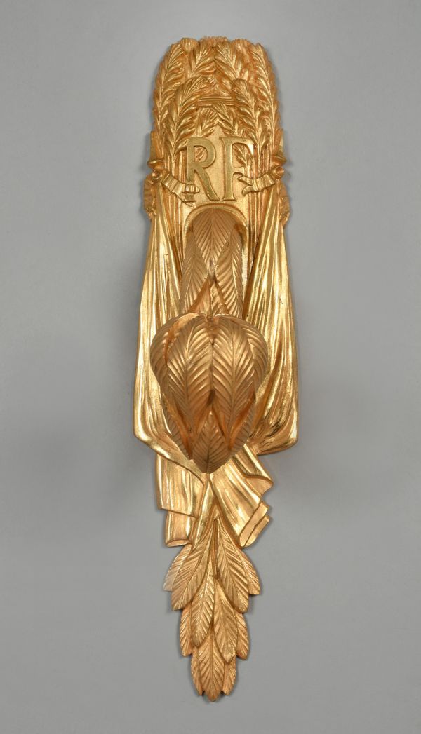 Patère formée de 2 drapeaux en faisceaux surmontés d'épis de blé encerclant le monogramme R F ; feuilles de laurier à la base.