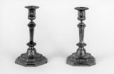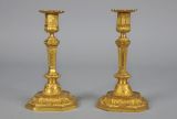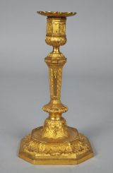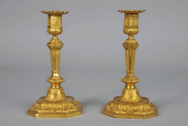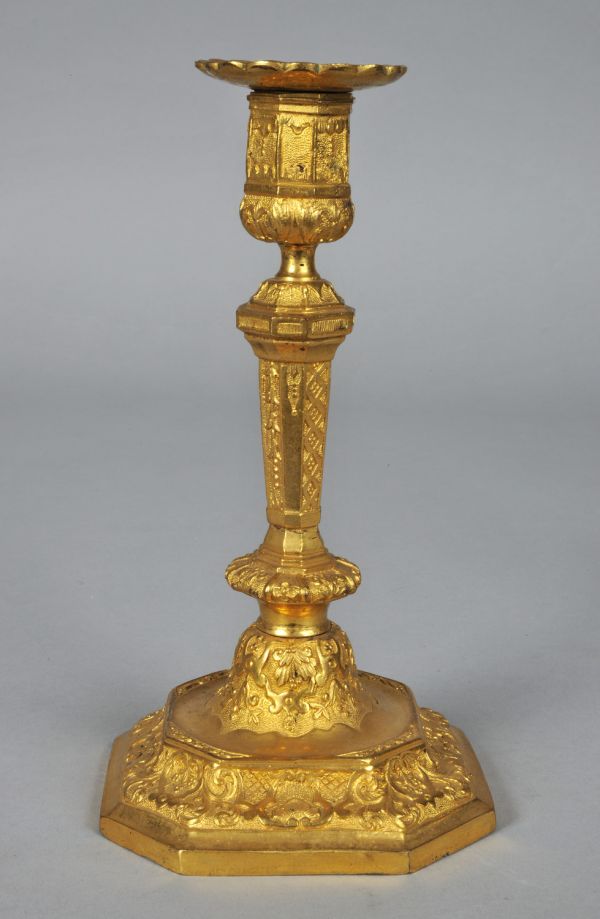 Base carrée à angles coupés complètement ciselés, ornement rinceaux, centre tourné et ciselé, piédouche à renflement ciselé. Fût de section carré à angles abattus tout ciselé et surmonté d'un vase de même plan ciselé de feuilles et petits panneaux formant binet et bobêche ciselée et festonnée.