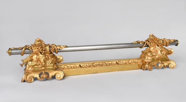 Feu à galerie composé de deux socles ajourés portés par des doubles volutes, surmontés d'un trophée avec cornemuse, cor, tambourin, et tête de bélier, feuilles et branches de vigne enroulant une tige acier horizontale. Ces socles sont réunis par une traverse à cavet, orné de médaillons et de rinceaux ciselés.