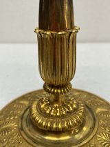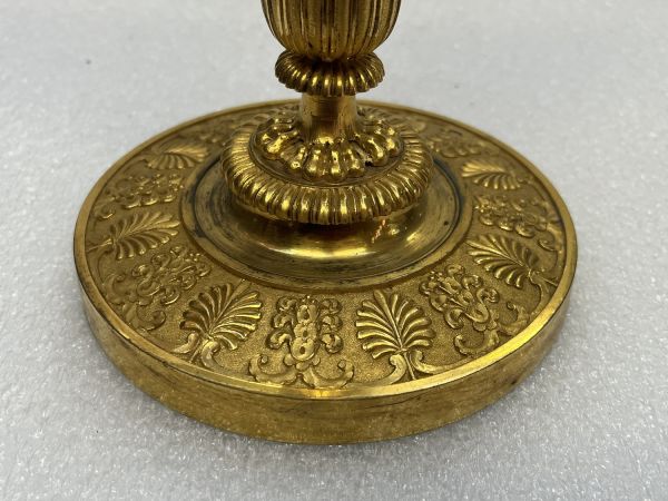 Base ciselés avec frise de palmettes, godrons, piédouche formé de 4 griffes de lion adossées, surmonté d'un culot de feuilles. Fût conique, vase godronné.