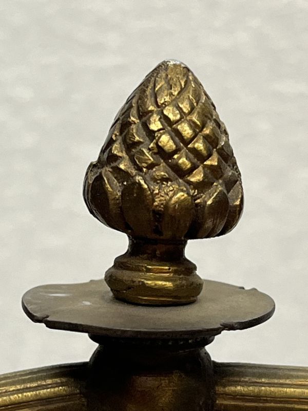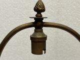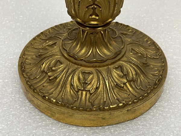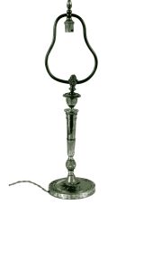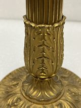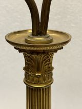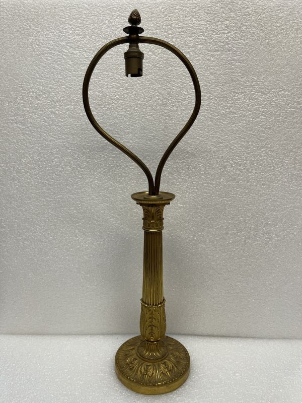 Socle tourné bord avec frise de culots opposés et alternés d'une étoile. Centre bombé portant le piédouche ciselé 2 feuilles et 2 palmettes, surmonté d'une boule ornée d'étoiles et portant le fût conique dont la partie inférieure décorée de feuilles d'eau et d'écailles, la partie médiane unie, la partie supérieure évasée portant un vase ovoïde ciselé godrons et formant bobèche avec binet moleté monté avec rotule portant une lyre équipée et abat-jour.