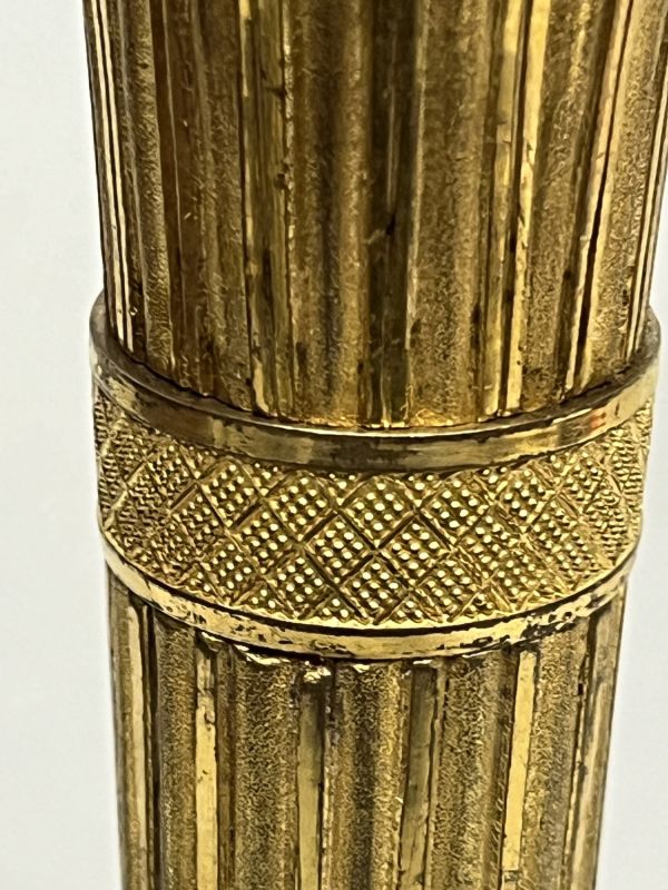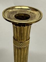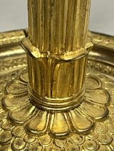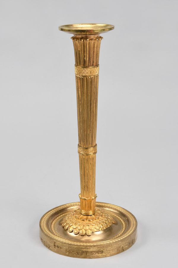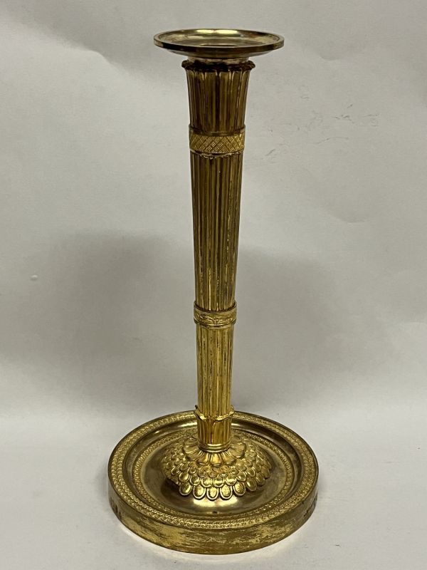 Base circulaire à bord moleté feuilles intérieur creusé et remonté en dôme à 4 rangs de feston et rosace supérieur fût en graine tournée à base en culot feuilles d'eau et à petit godron dans 2 bagues et évasé pour former bobèche à binet uni.
