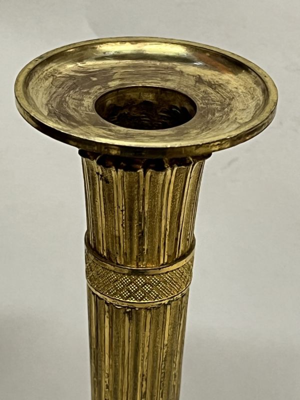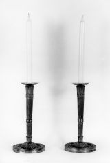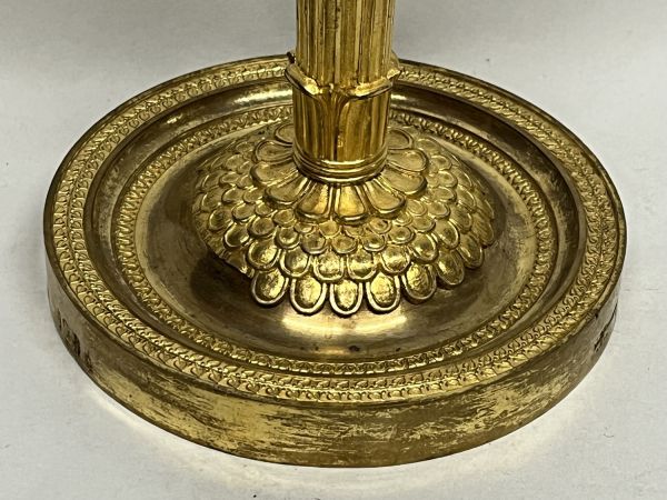 Paire de flambeaux livrée par Claude Galle, fabricant de bronzes, le 23 juin 1811 pour le salon de l’appartement de l’impératrice au-dessus du billard au hameau de Trianon. Renvoyée au Garde-meuble en mars 1854 et installée de 1854 à 1859 dans l’appartement du premier médecin rue Saint-Honoré.
