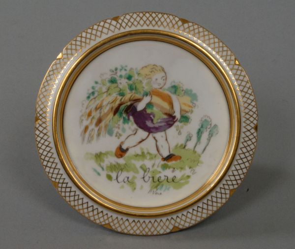 Forme circulaire, bord décoré de festons et grilles dorés, milieu fond creux. Décor "l'eau" femme sous un parapluie, un broc d'eau à la main.
