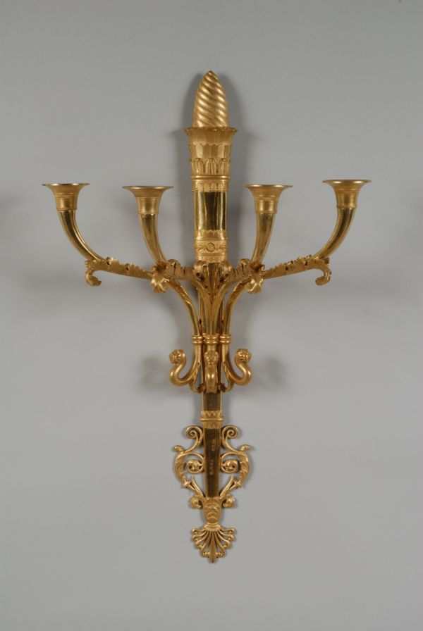 Flambeau méplat vertical, terminé dans la partie basse en culots, rinceaux, et palmette, découpés, partie haute évasée ornée de feuilles et d'écailles, surmontée d'une flamme torsadée. De la partie médiane partent à droite et à gauche deux branches en doucine avec feuilles ciselées terminées en bas par une crossette à tête de lion ; dans le haut en cornet avec bassin évasé uni au dessus d'une bague moletée et formant binet ; dans l'axe une même crossette à tête de lion, d'où partent deux branches en cornet semblables aux autres.