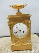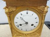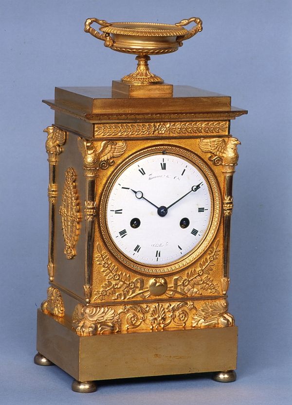 Boules aplaties supportant socle rectangulaire uni. Borne rectangulaire à pattes de lion écrasées aux angles flambeaux encastrés aux 3/4, surmontés d'un oiseau, architecture, corniche avec feuilles de lauriers et feuilles d'eau, couronnée d'une coupe finement ciselée. Cadran émaillé blanc "Thomire et Cie Schüller horloger"; lunette molletée, côtés ornés de motifs de lauriers et flambeaux.