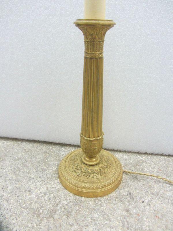 Socle circulaire mouluré, bord moleté festons et rais de coeur, couronne de vigne ciselée. Fût effilé à godrons base en culot de feuilles d'acanthe, sommet évasé à guirlande de feuilles verticales surmonté rosaces sur entrelacs. Abat-jour satinette champagne plissée bord et sommet à franges. Monté sur douille double bague.