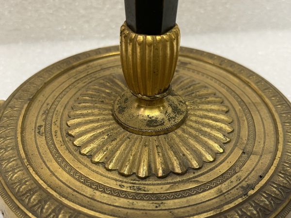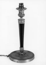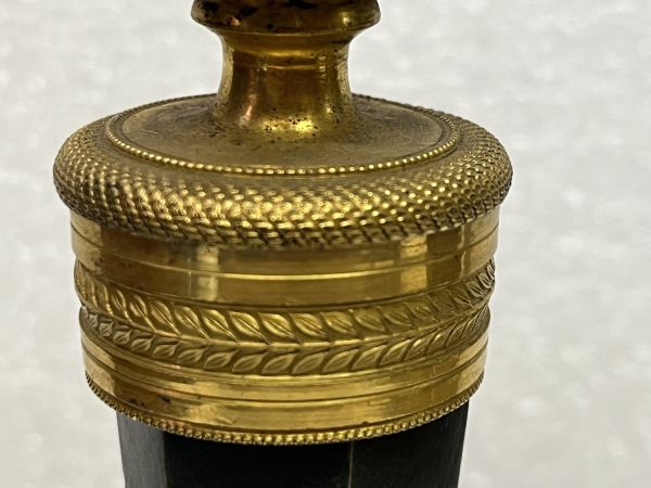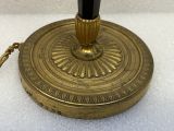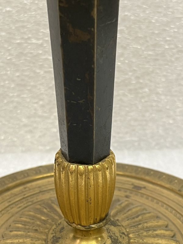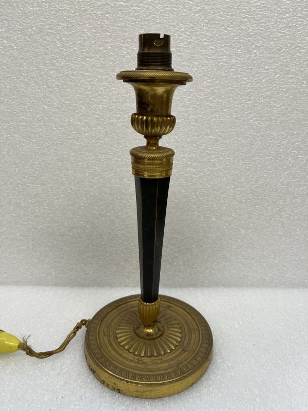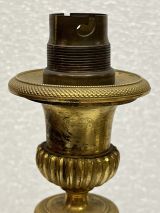 Base circulaire plate moulurée bord feuille d'eau, centre rosace et godrons, petit piédouche le haut à godrons, le tout doré ; fût à 6 pans en gaine oxydé, couronné d'une bague moletée servant de base à un vase forme médicis, panse godrons évasé formant bobèxhe et binet bord moleté, équipé douille double bague supportant l'abat-jour pongé crème/
