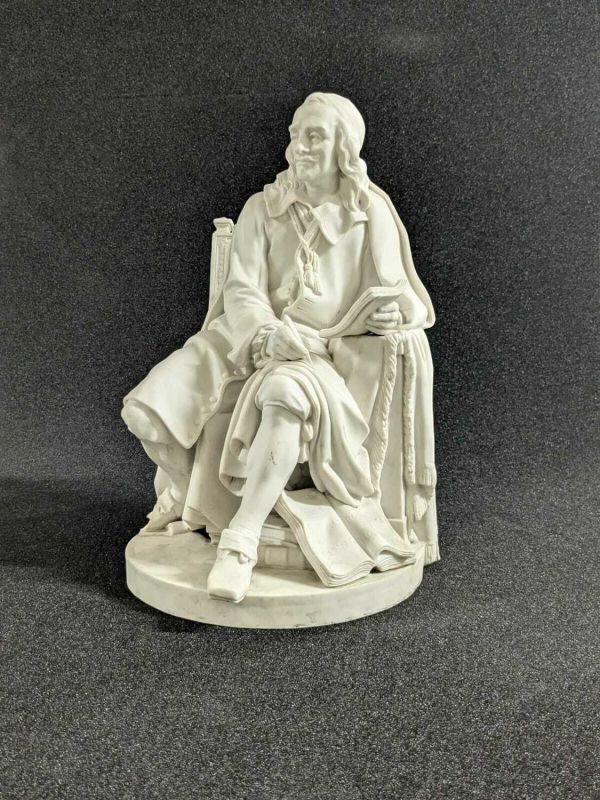 Réédition datée de la fin du XIXe siècle d'un biscuit de porcelaine, représentant Corneille. Il est tiré de la série des statues de marbre intitulée "Les Grands hommes de la France", commandée par le comte d'Angiviller en 1776. La première édition de ce biscuit par la manufacture de Sèvres date de 1783 (livré la même année) ; il fut réédité tout au long du XIXe siècle.