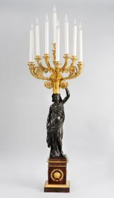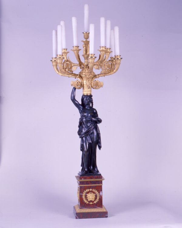 Versement du château de Rambouillet, le 3 novembre 1948 : "2 candélabres Empire en bronze doré, bronze vert et marbre griotte, à 10 lumières dont une centrale ; base en marbre griotte surmontée d'une femme drapée en bronze vert supportant une corbeille de fruits en forme de cornet à décor de rinceaux et de feuilles" (inventaire des meubles de lustrerie, vol. 3, p. 84, GML 6442).
