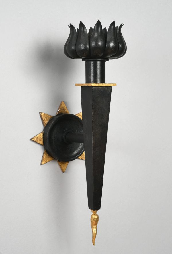 Platine circulaire en cuvette unie ornée au pourtour de 8 triangles dorées formant étoile. Au centre 1 tige horizontale supportant un flambeau vertical carré en gaine terminé en queue de cochon dorée et surmonté d'une collerette en feuilles découpées formant cache ampoule.