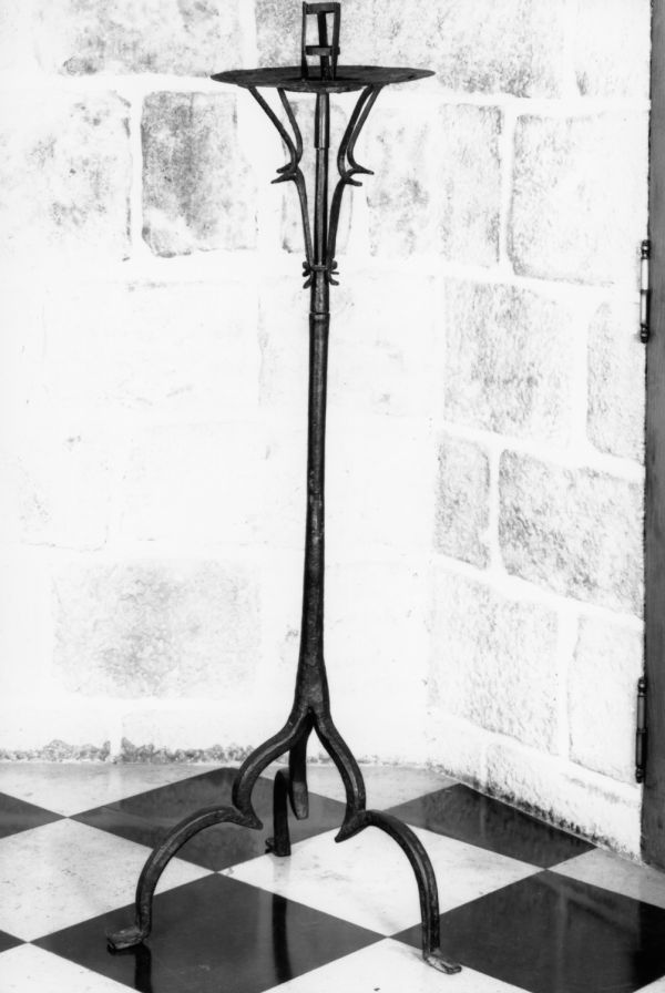 Trépied formé de pattes en double arc brisé se réunissant au centre pour former tige verticale supportant à l'extrémité supérieure une bague et sur sa pointe un plateau circulaire bord dentelé lequel est monté par 4 tiges formant gaine tournante en dessous et dans le plateau une armature de 3 tiges et 2 anneaux engainant le cierge.
