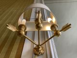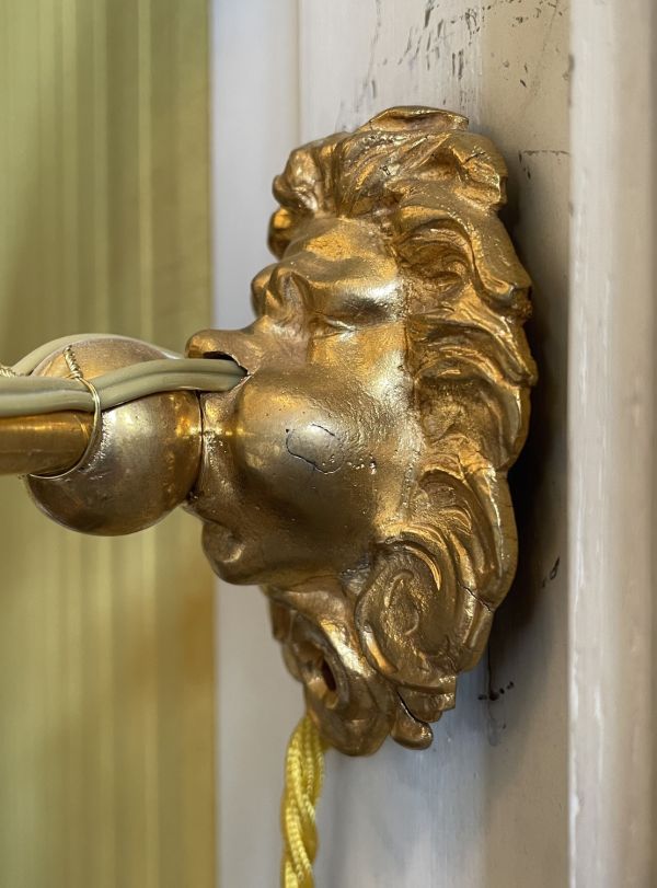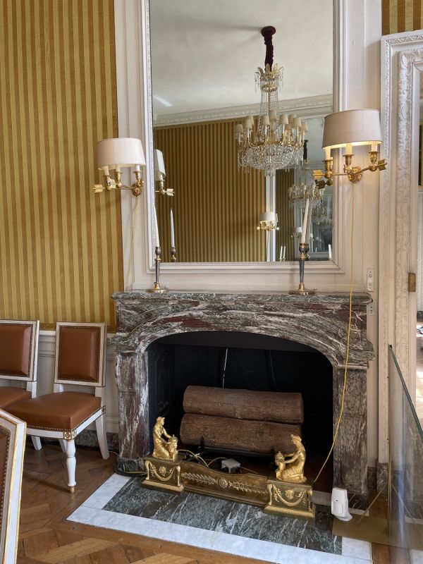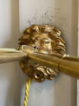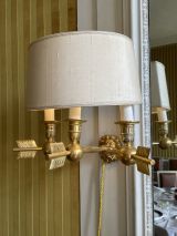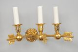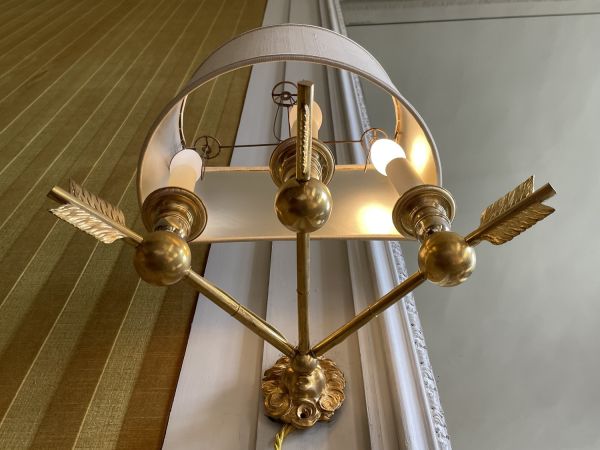 Platine en masque soufflant, une boule tenant 3 flèches, dont l'extrémité est enfilée sur une boule surmontée d'un vase formant binet et bobêche molettés. Equipée fausses bougies.