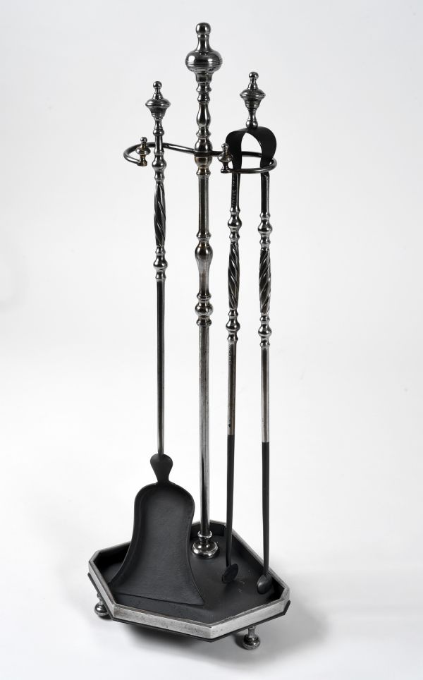 - Acier et boutons cuivre. Plateau triangulaire sur patins tournés. Tige à balustre tournés.