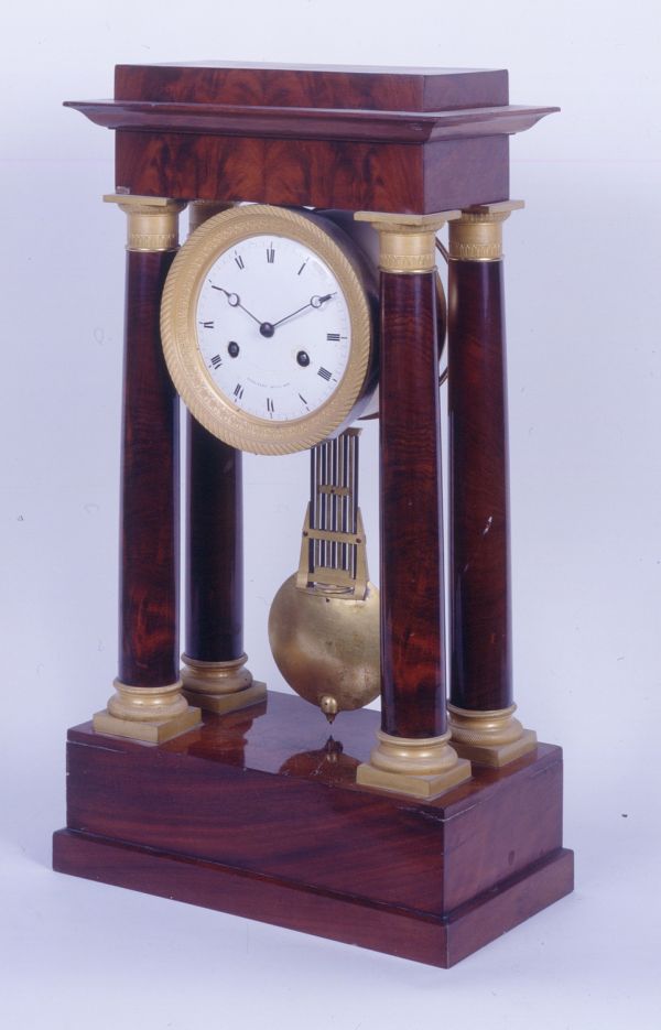 4 colonnes tournées à socle et chapiteau bronze moleté sur socle rectangulaire à plinthe unie tailloir rectiligne à corniche en moulure saillante. Cadran circulaire émail blanc signé "Rieussec horloger du roi", chiffres noirs. Lunette moulurée et moletée perles et rosace sans verre. Balancier à régulateur.