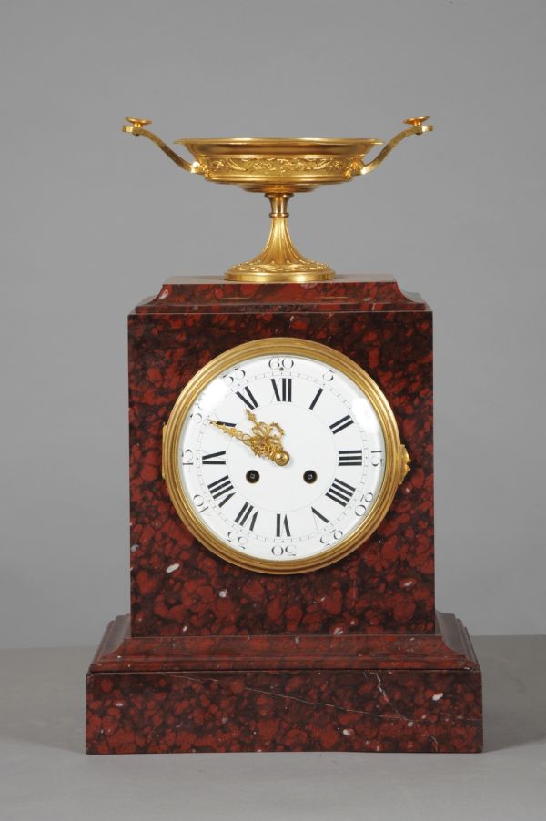 Forme carrée dessus à gorge comme la plinthe saillante Cadran émaillé blanc chiffres noirs " Bouquet Paris" Lunette bombée ouvrante. Au sommet : coupe bronze ciselé et cannelé.