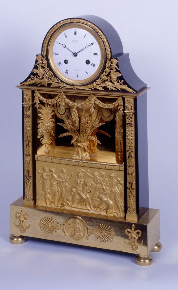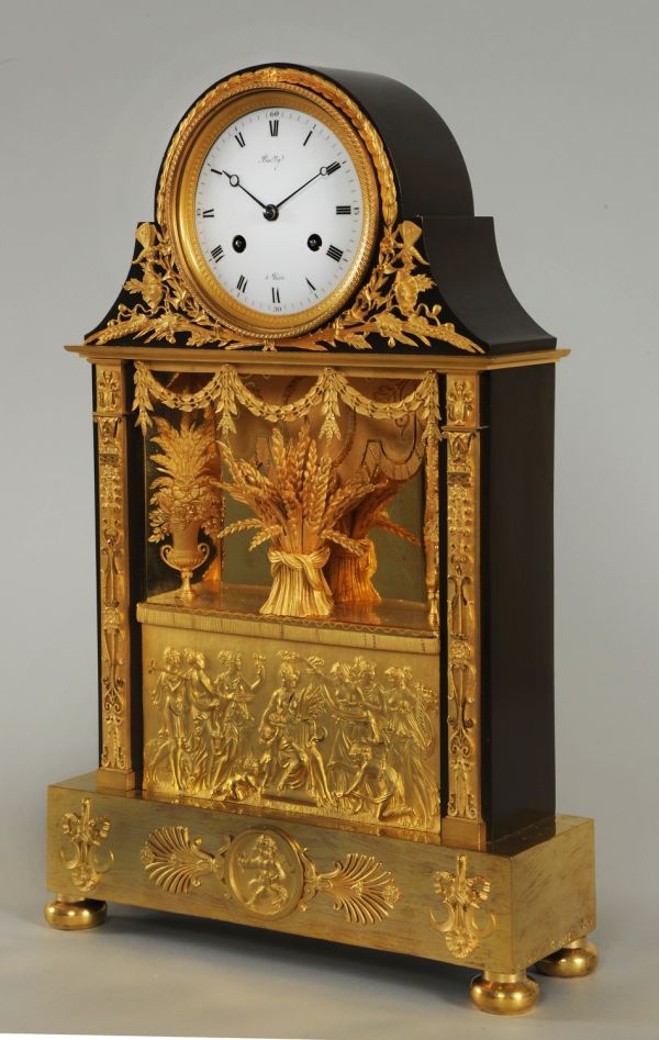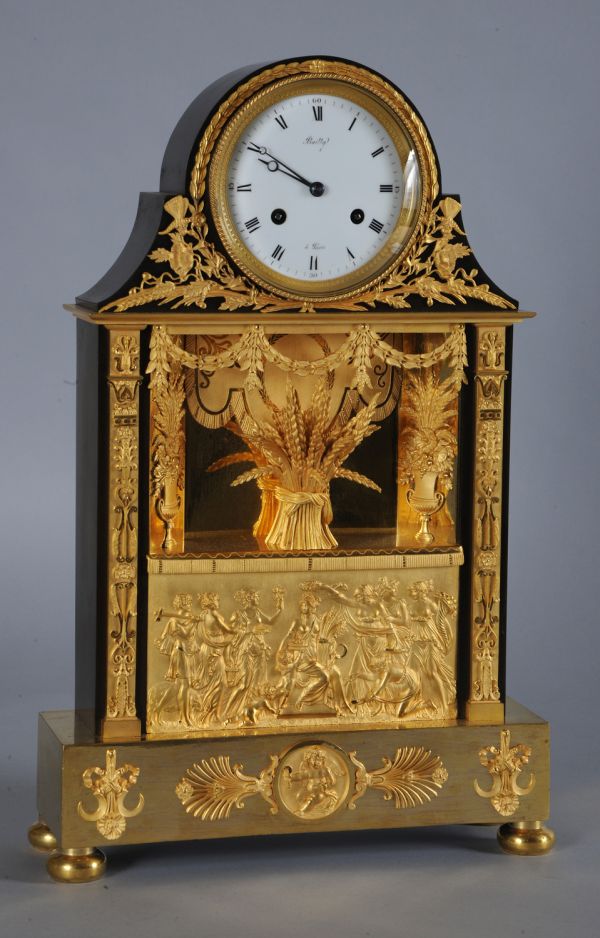 Socle rectangulaire doré sur 4 pieds miche ; face à applique à médaillon circulaire, ange assis, prolongé en palmettes et rinceaux. Motifs aux extrémités 2 faucilles à noeud rubans; dessus rectangulaire formant scène de guignol en niche trapézoïdale ; montants et côtés noirs. Pilastres droits ciselés rinceaux et culots, sous la niche bas-relief : Cérès assise entourée sujets drapés et anges. Dans la niche 1 gerbe de blé épanouie et appliques de vases à fruits et épis, guirlandes supérieures en festons, moulures en petite corniche entablement. Fronton en borne cylindrique et à côtés en cavet bronze noir à appliques or, épis coquelicots et papillons plus son cadran circulaire moleté avec lunette ouvrante verre bombé. Vers 1807.