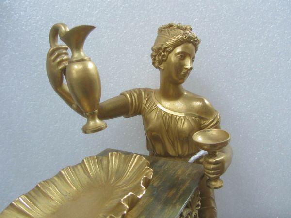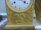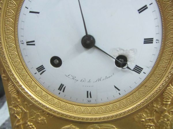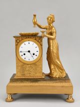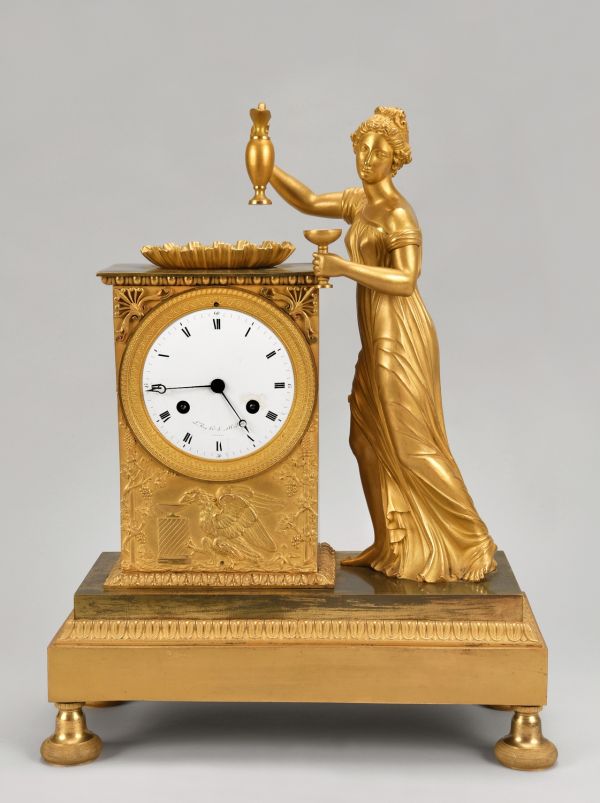 Pendule en bronze doré comportant un socle rectangulaire à doucine ornée de feuilles d'eau le tout reposant sur quatre pieds miches prolongés en cloches. Au-dessus, sur la gauche, une borne rectangulaire. Sa base moulurée ciselée avec décor de feuilles et corniche à oves. Sur la face avant se trouve le cadran circulaire décoré de palmettes et grecques. Le mouvement est signé « Le Roy Hr. De Madame à Paris». Sous le cadran, un bas-relief représentant un aigle accroupi s'abreuvant entre deux treilles de vigne. Les écoinçons supérieurs sont ornés de palmettes et rinceaux. Le sujet principal illustre Hébé versant le nectar aux dieux. A droite de la borne, se tient debout Hébé drapée tenant d'une main une coupe et de l'autre une aiguière soutenue au dessus d’une coupe en forme de coquille placée sur le sommet de la borne.