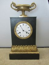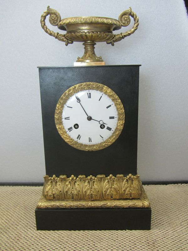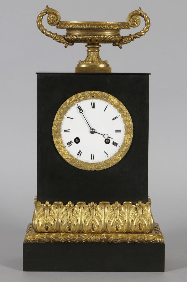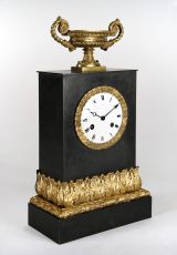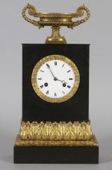 Pendule borne composée d’un soubassement marqué par une moulure de feuilles de laurier en bronze doré sur laquelle reposent des feuilles d’acanthe disposées verticalement sur la partie principale du socle. Au centre, prend place le cadran émaillé blanc signé "L. Mallet horloger du roi", à lunette dorée ornée de feuilles de lierre. Sur cette borne, placée sur un petit socle rectangulaire en bronze doré, une coupe ovale aux anses torsadées en bronze ciselé et doré. A l'arrière, lunette ouvrante à verre dépoli.