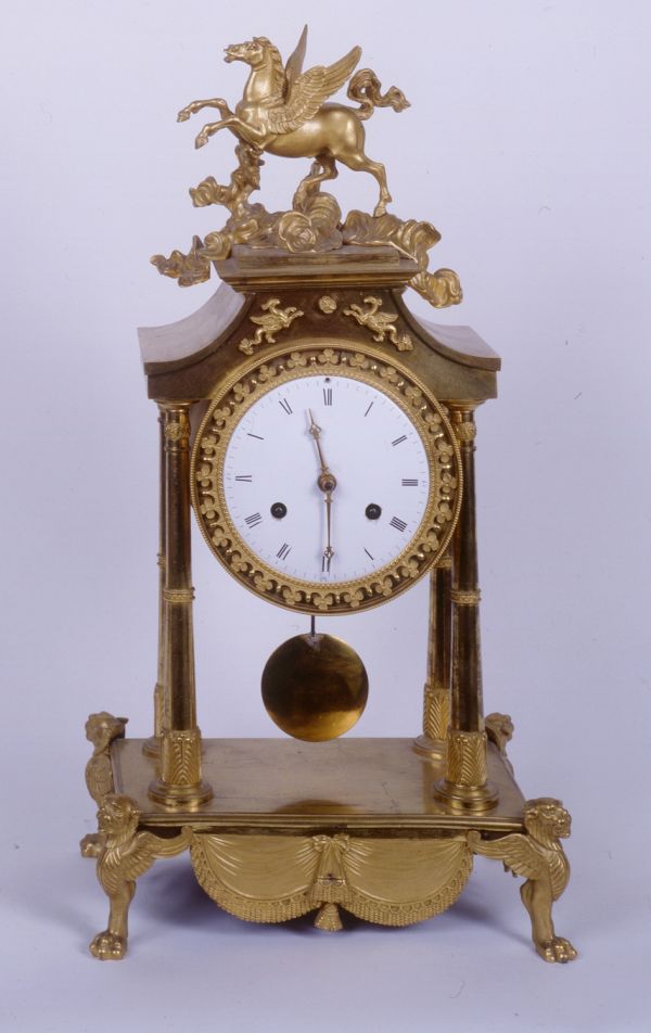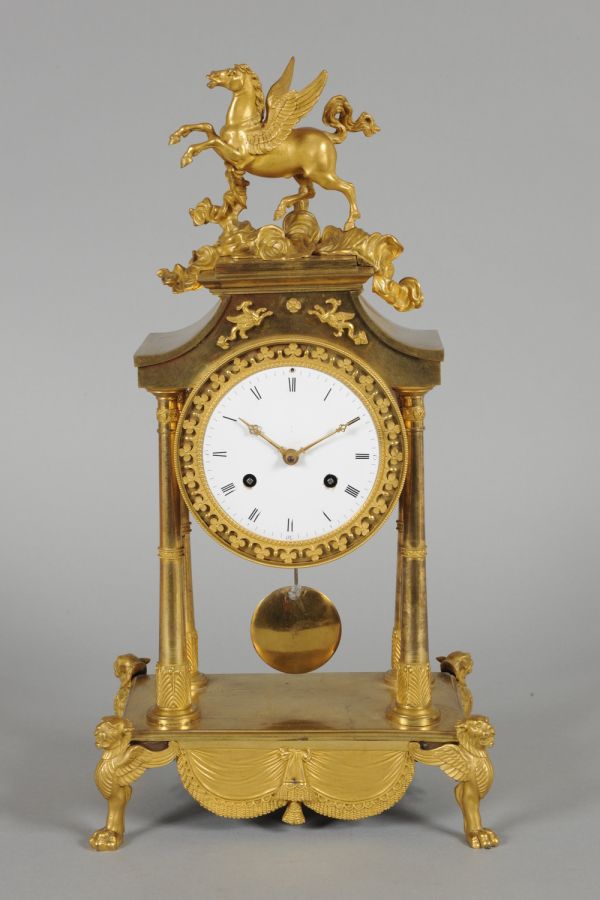Bronze doré. 4 griffes ailées sur pattes de lion portant une table rectangulaire moulurée jonc sur les faces tablier en draperie sur les côtés demi-rosace ajourée. Au dessus 4 colonnettes coniques, base palmettes et petites bagues supportant un fronton rectangulaire à épaulement ; dessus carré surmonté d'un nuage avec cheval ailé ; entre les colonnes le mouvement dans un tambour, la lunette fixe ciselée ajourée, sur fond creux et cadran émail blanc.