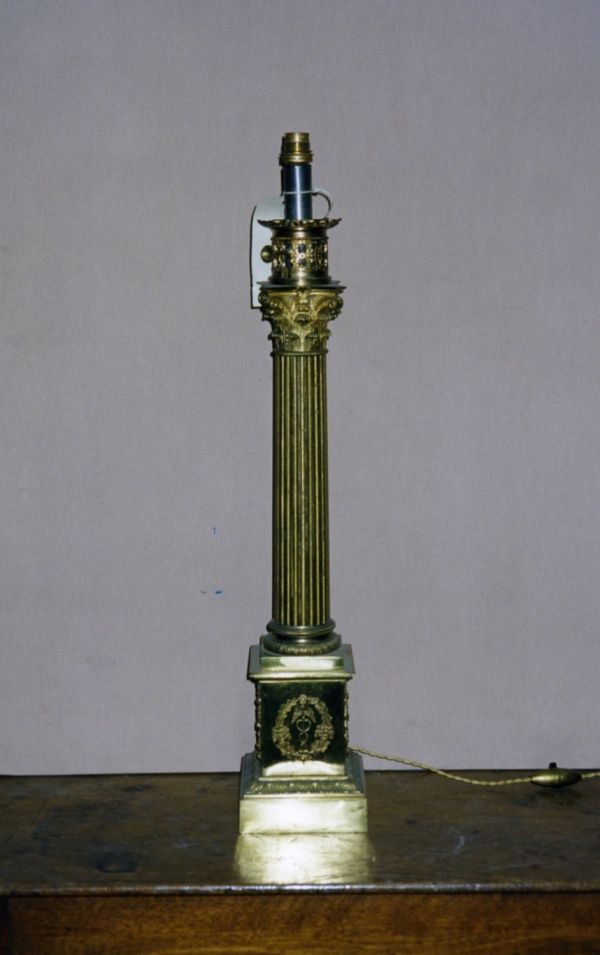 - Base cubique unie à 4 appliques dans couronne de fleurs 2 à caducée ailé et 2 à carquois en croix. Fût en colonne cannelée socle tourné moletté chapiteau corinthien sous bague ciselée ajourée enrobant la clef de réglage cylindre fer avec douille électrique au sommet.