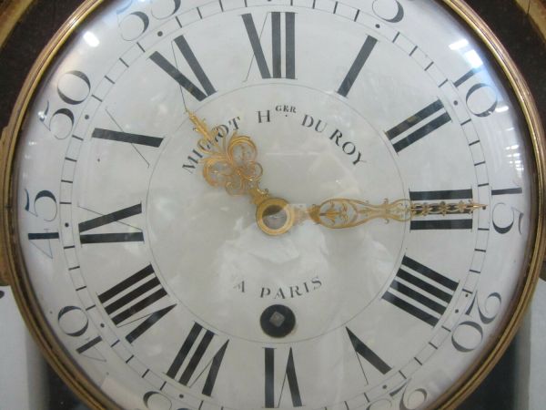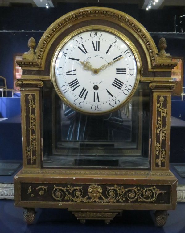 Décrite à l'inventaire du château de Rambouillet en 1909 comme "pendule Louis XVI en carton pierre". Socle rectangulaire porté par 4 pommes de pin, et au devant un petit tablier cachant le coffre du battement du balancier. La base est ornée de panneaux sculptés de rinceaux , surmonté de 4 pilastres encadrant la cage en verre et surmontés de pommes de pin, panneaux fonds creux décorés de feuillages et de chapiteaux ioniques, portant une architecture avec fronton demi-cercle sculpté de feuilles d'eau et rubans; au centre le grand cadran émaillé est signé "Millot horloger du Roi à Paris". Les panneaux du socle et des pilastres sont sur un fond laqué imitation écaille. (grand balancier régulateur)