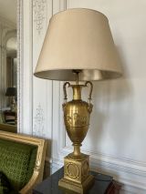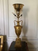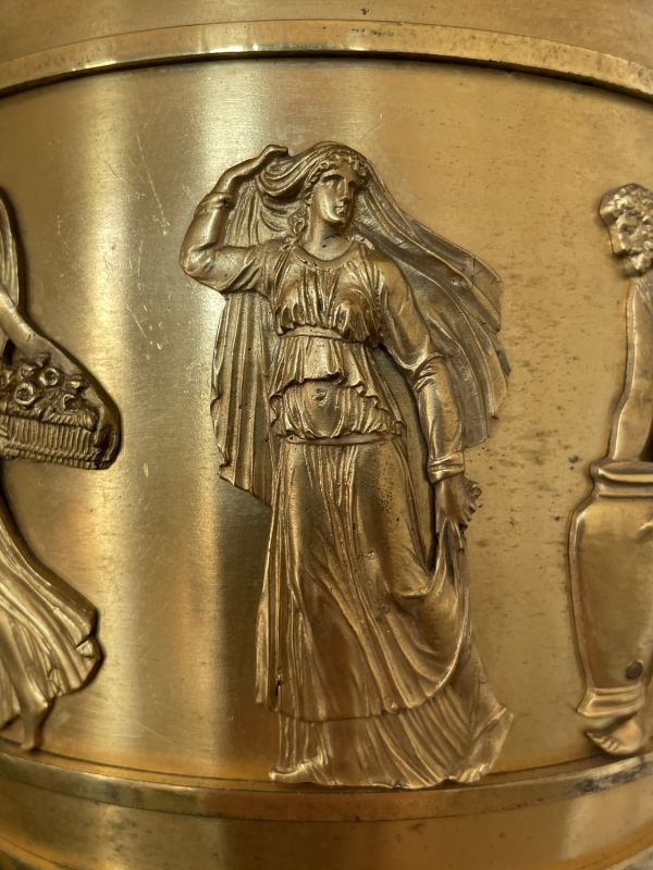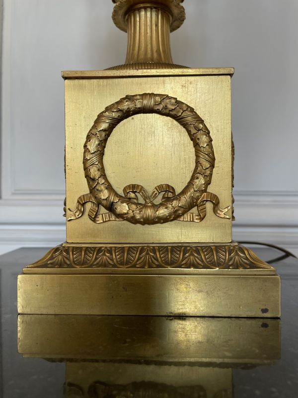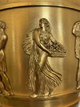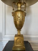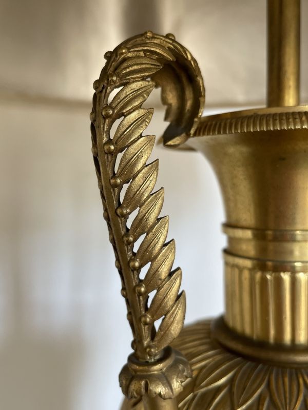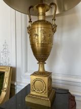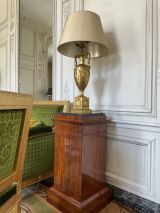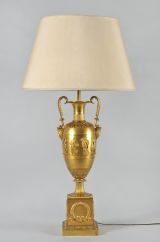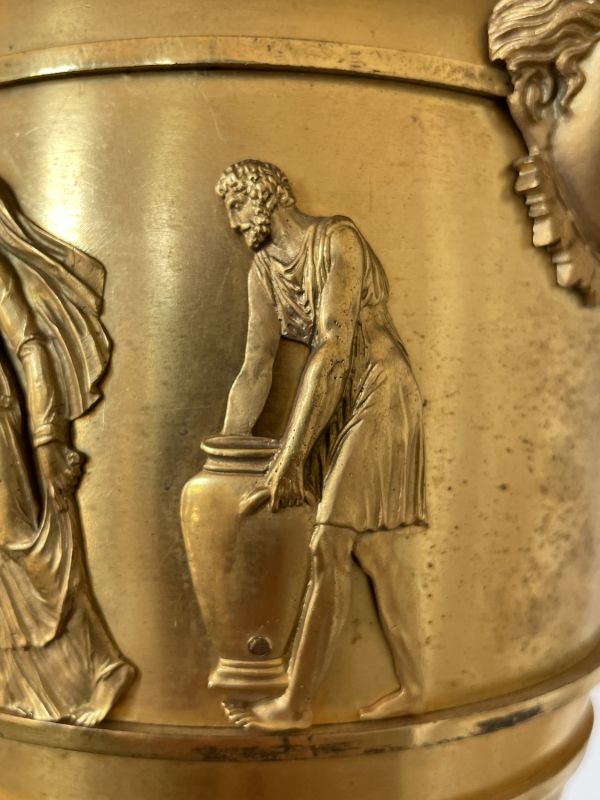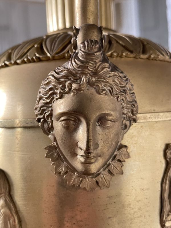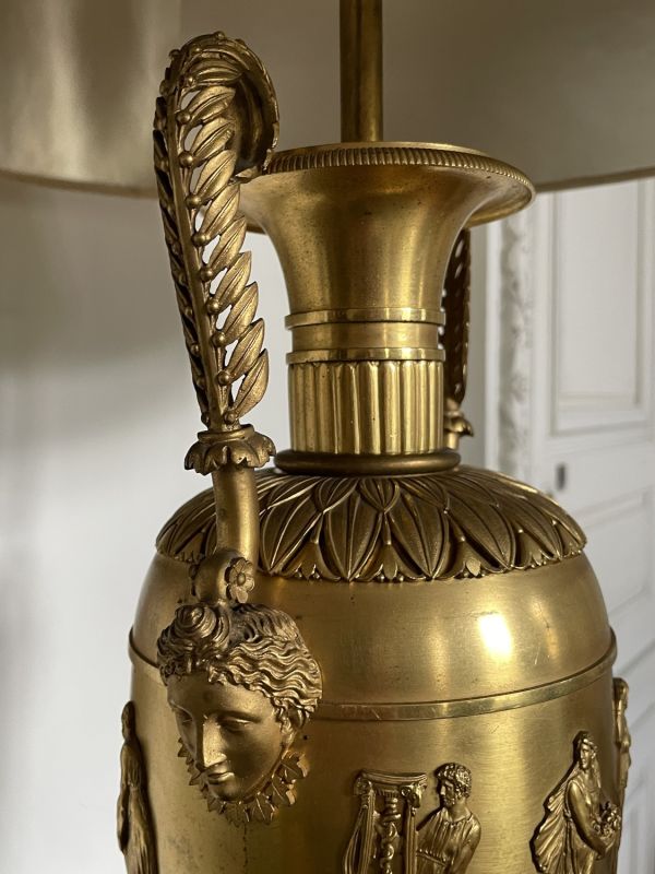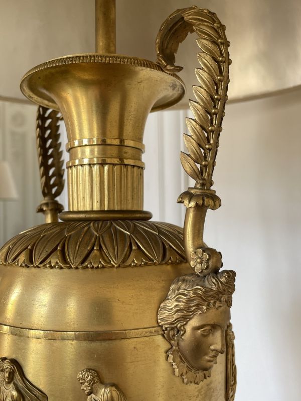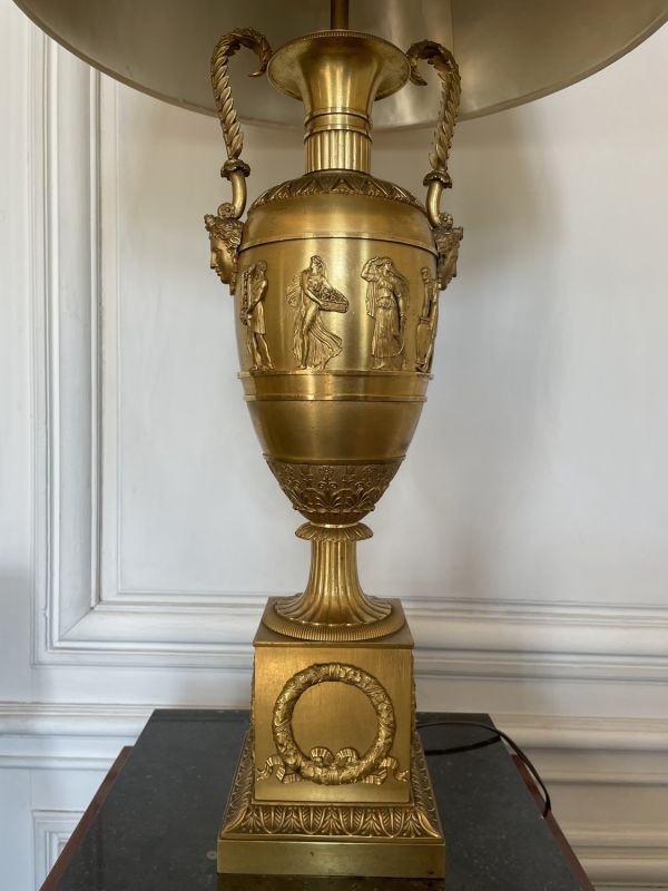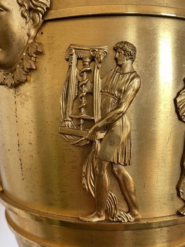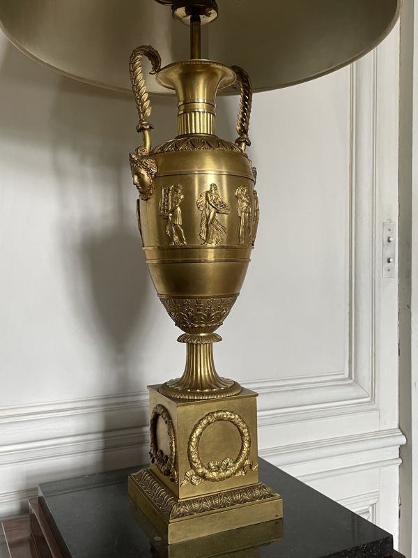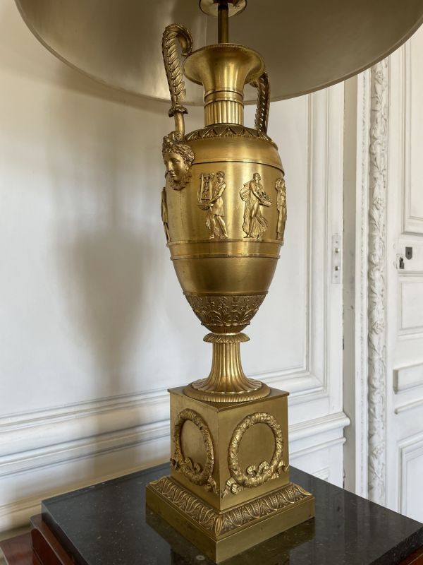Vase tourné en amphore, bagué centre à ceinture en applique ciselée de sujets mythologiques (Personnages debouts) Base à palmettes rinceaux et rosaces, pied en culot retourné festonné. Socle carré à plinthe en doucine ciselée palmettes et feuilles, les 4 faces à couronne d'acanthes nouée ruban. Platine saillante en corniche. 2 Anses en palmes de laurier sur 2 têtes féminines. Col évasé en arc après 2 rangs feuilles d'eau ; bord azuré.