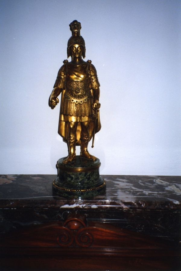 Socle circulaire et marbre vert de mer à moulure bronze de perles et pirouettes. Un empereur romain en guerrier tient un parchemin dans la main droite.