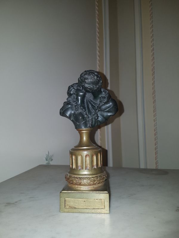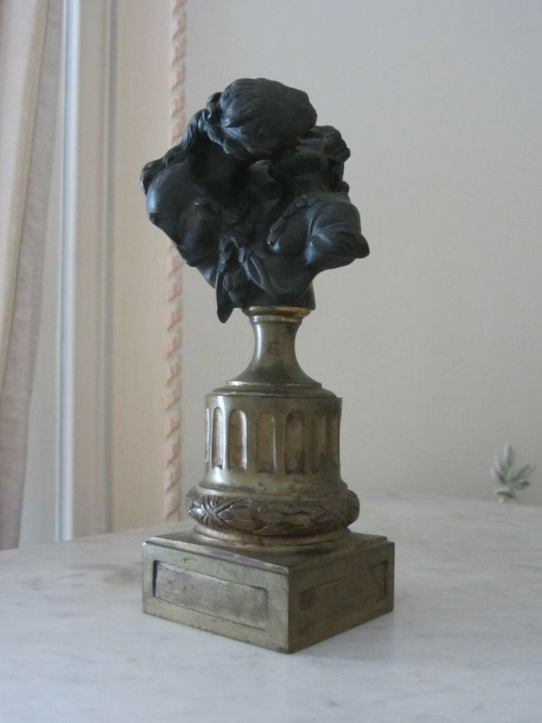 Socle carré à fond creux sous tronc de colonne cannelée à tore de laurier et piédouche. bustes d'une femme embrassant un homme barbu.