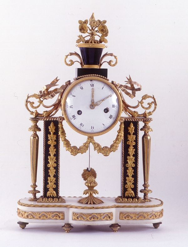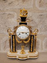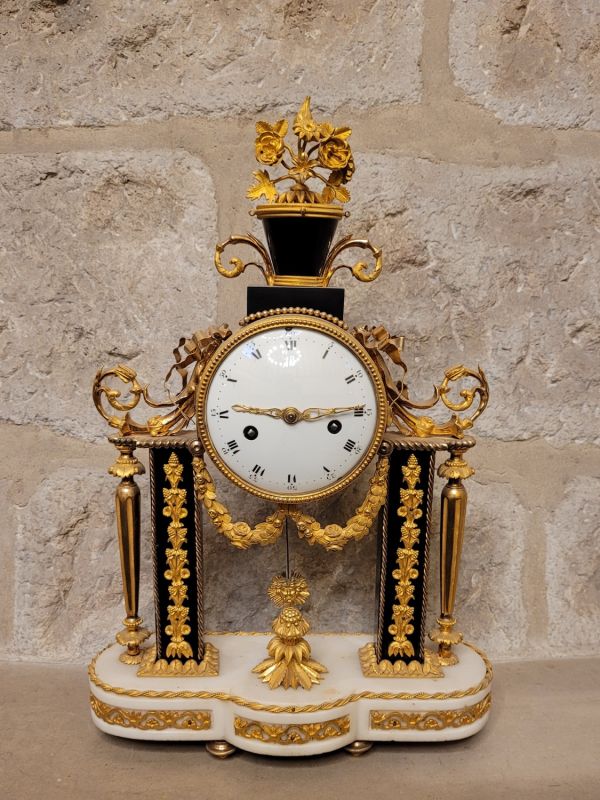 Deux pilastres marbre noir, socle en culots ciselés, face à chûte ciselée feuilles, fleurs et graines. En bronze chapiteau plus large reposant sur colonne en graine cannelée entre deux rosaces dentelées, cadran cylindirque entre deux rinceaux et rubans; lunette ouvrante à perles.