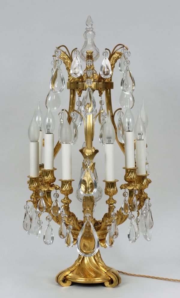 Piédouche circulaire, cannelé en torsades, entre 3 acanthes à base en agrafe double formant pieds ; plateau à bec de corbin, le centre à épi cristal entouré de 3 supports, de section ovale, en doucine, la base enrobée feuille d'acanthe le sommet à tête d'épervier, après plateau triangulaire concave portant 1épi central et 3 coquilles ciselées. Entre supports 2 groupes de 4 branches chantournées enrobées feuille, 2 plus hautes évasées en culot formant bobèche, les 2 petites à petit culot retombant. 8 binets tournés cannelés torsadés à base feuilles ciselées. Perles et pandeloques ovoïdes en cristal à chaque crossette et becs.