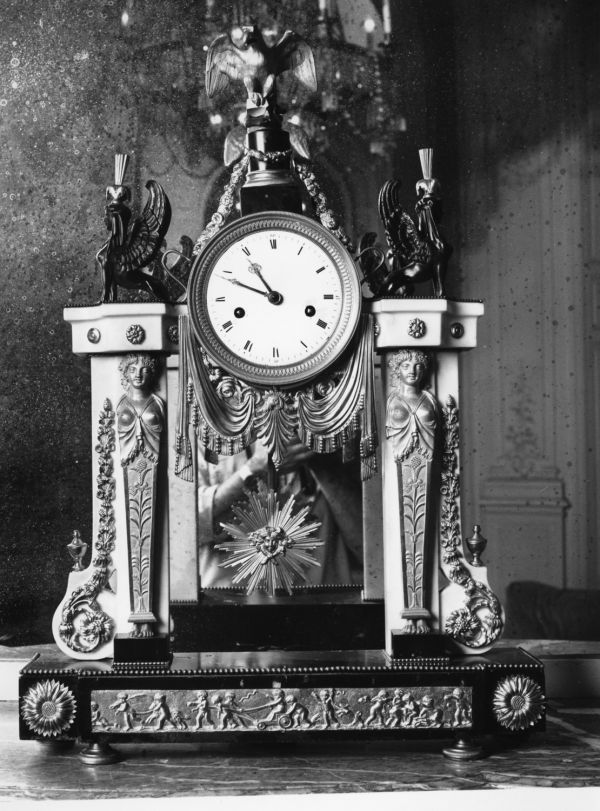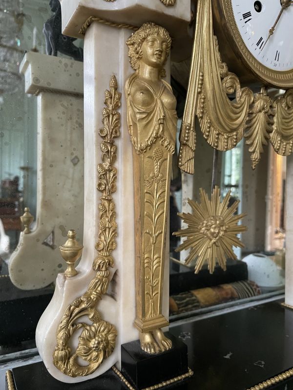 Sur 4 pieds miches molettés, un socle rectangulaire, marbre noir, orné sur la façade avancée. Au centre d'un bas-relief représentant des Amours entre 2 rosaces marguerites. Un portique de marbre blanc flanqué de médaillons à appliques de bronze ciselé et doré, cantonné de 2 cariatides engainés à pieds nus, en bronze ciselé et doré. Cadran surmonté d'un piédestal enguirlandé dominé par un aigle déployé en bronze doré, à gauche et à droite du cadran, sur l'entablement un sphinx en bronze médaille, coiffé d'un panache de bronze doré. Sous le cadran : une draperie de bronze doré avec balancier apparent en masque féminin rayonnant doré
