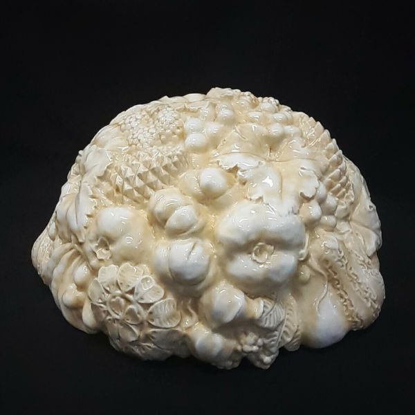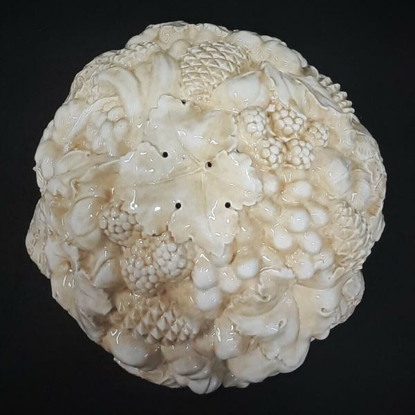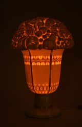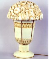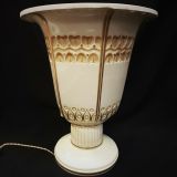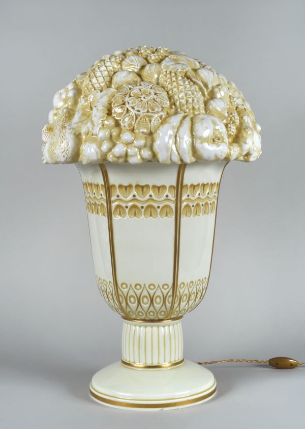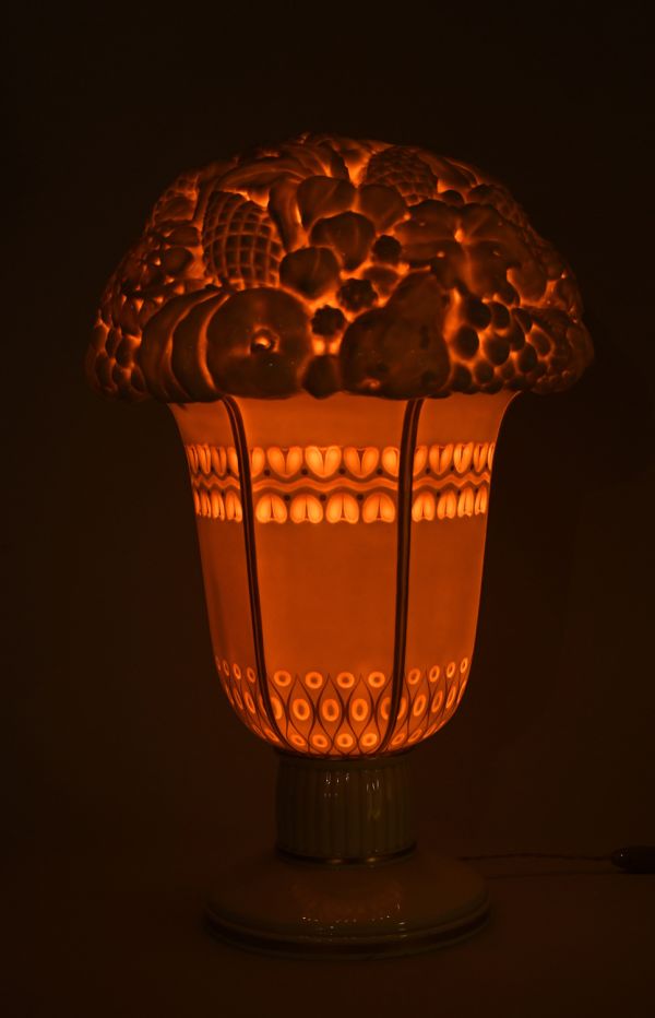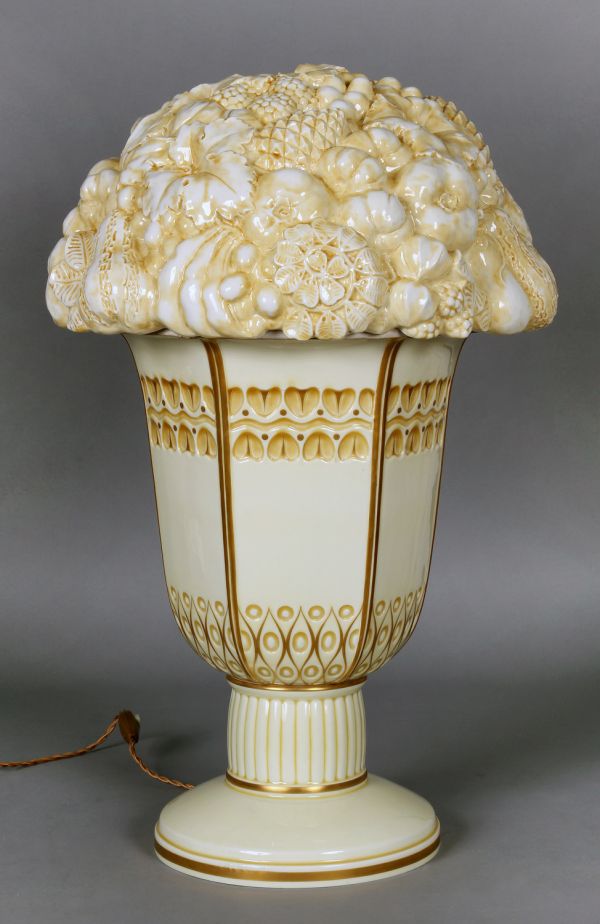 Base circulaire légèrement bombée, bord droit or, sous petit cylindre godronné entre 2 arrondis dorés, vase en cloche retournée mais le pourtour en 6 pans séparés d'un double filet or, décors de petots ronds la base et en large bague vers le haut. Gros tas de fruits divers en 1/2 sphère débordante sur ce vase. Ce motif sert de couvercle. Equipé électricité.