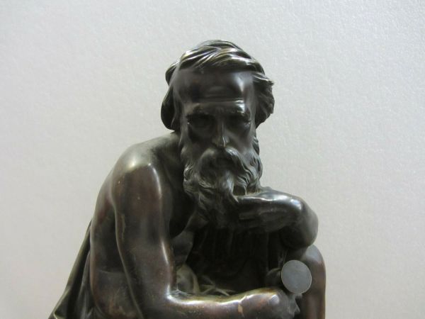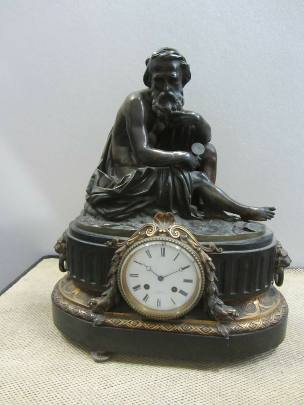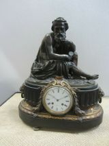 Pendule constituée d'un socle en marbre noir soutenu par trois pieds en bronze doré à décor de godrons. Au dessus, un cerclage en bronze doré constitué d'une frise de rosettes insérés dans des losanges surmontée d'une seconde frise de coquilles. Le tout est sommé d'un second socle cannelé où est fiché le cadran surmonté d'une coquille, de rinceaux et de deux guirlandes florales. Un personnage en bronze patiné représentant "le temps assis", un vieillard tenant un sablier à la main, termine la composition.