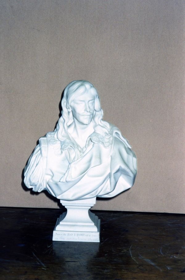 Socle carré à grosse gorge entre 2 carrés moulurés en 1/4 de rond. Buste en habit de XVIIème siècle et perruque habituelle. Sur le socle dédice et "fait par J.J. Gaffiéri 1783"