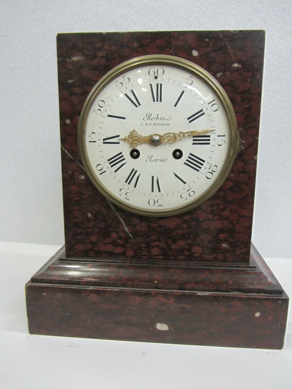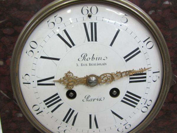 Socle rectangulaire parallélipipédique à moulure ; surmonté d'une coupe bronze doré et ciselée, décorée de branchages et de feuillages. Cadran émail blanc, signé "Robin rue Beaujolais Paris" Lunette tournée unie.